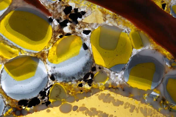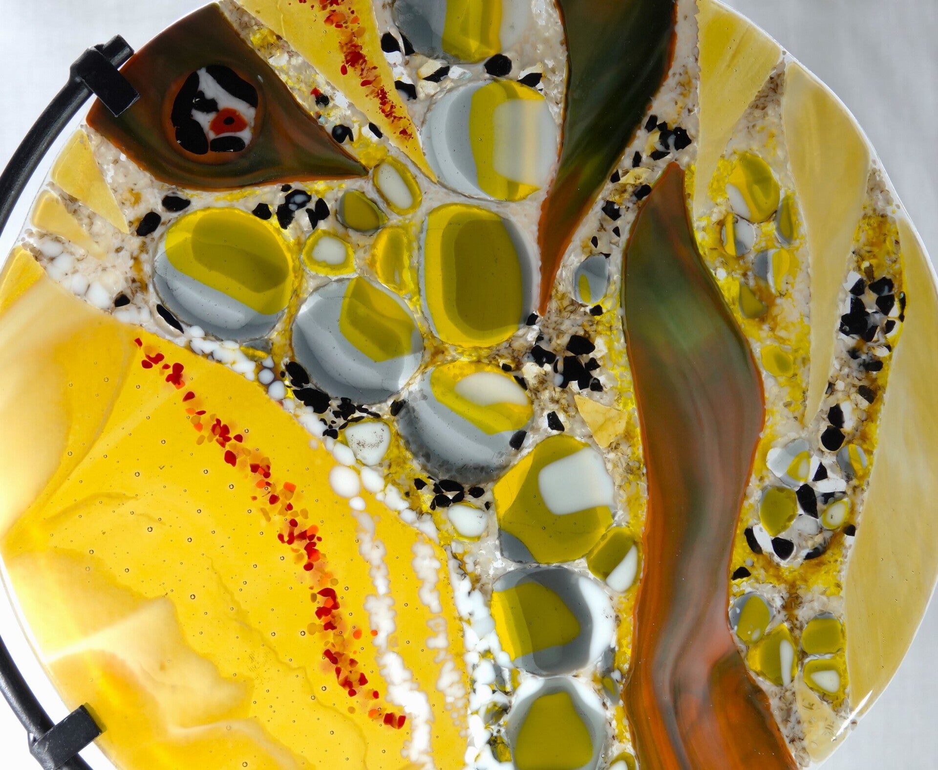 Beautiful colourful and patterned layers of different types of glass such as streaky layers of flat glass, frit, powders, and puddle glass. Puddle glass are layers of colours that have been fired once to stick together, taken out broken up then refired again on their sides and heated to a higher temperature melting the glass into a puddle shape. It is then used as part of the pattern.