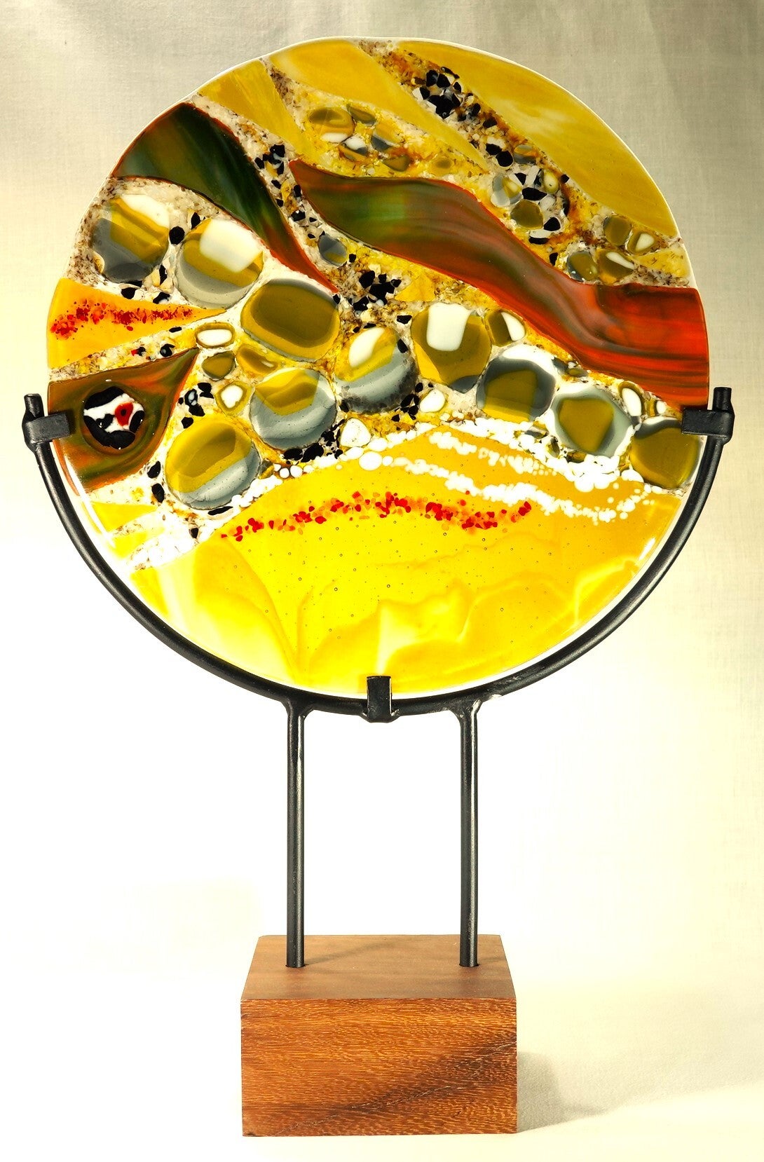 The glass disc is supported either in a handmade,1) half circle black steel stand, or another the 2)curvature has been rotated at the angle of a cresent moon. Your choice of the two.